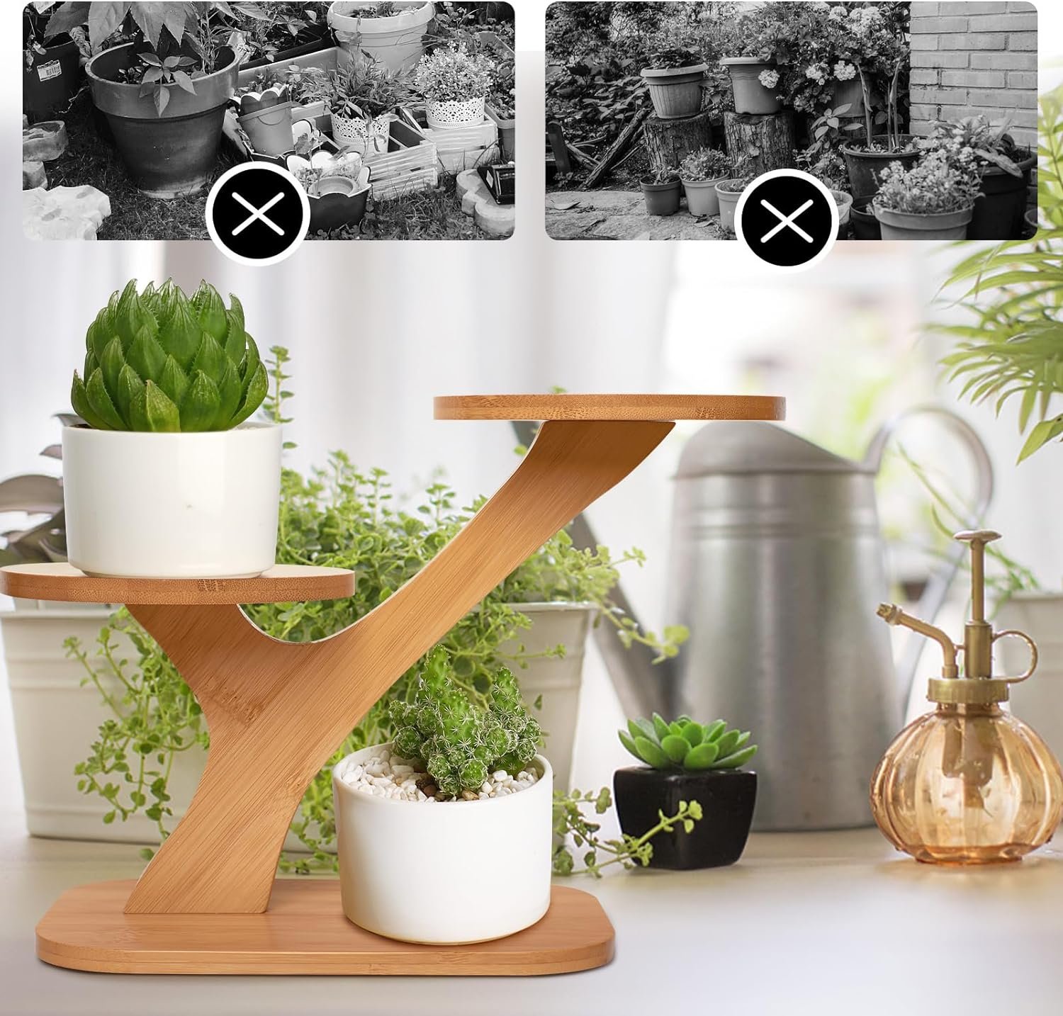 Natural Material: The tabletop plant stand is made of natural bamboo with two layers varnish on surface, designed with elegance and functionality in mind, this plant stand allows you to showcase your favorite potted plants, flowers, succulents, and herbs in a stylish and organized manner.