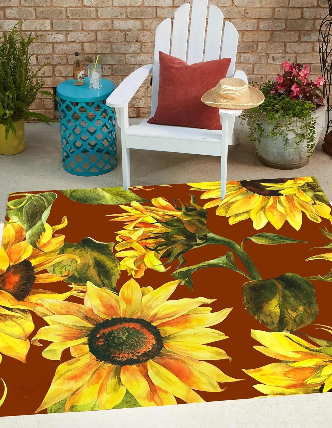 COMFORT & DURABILITY: Constructed for durability and longevity, this Nature Sunflower Floral Theme styled Washable rug is Power Loomed with weather resistant polypropylene and UV stabilized to reduce fading. Reducing exposure to rain, moisture, and direct sun will prolong the mats life.