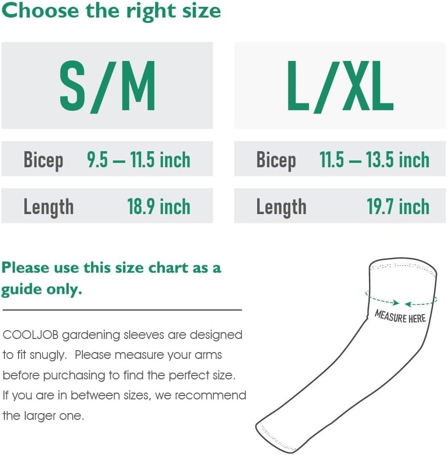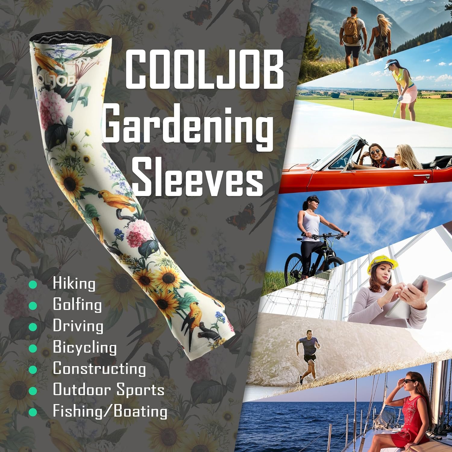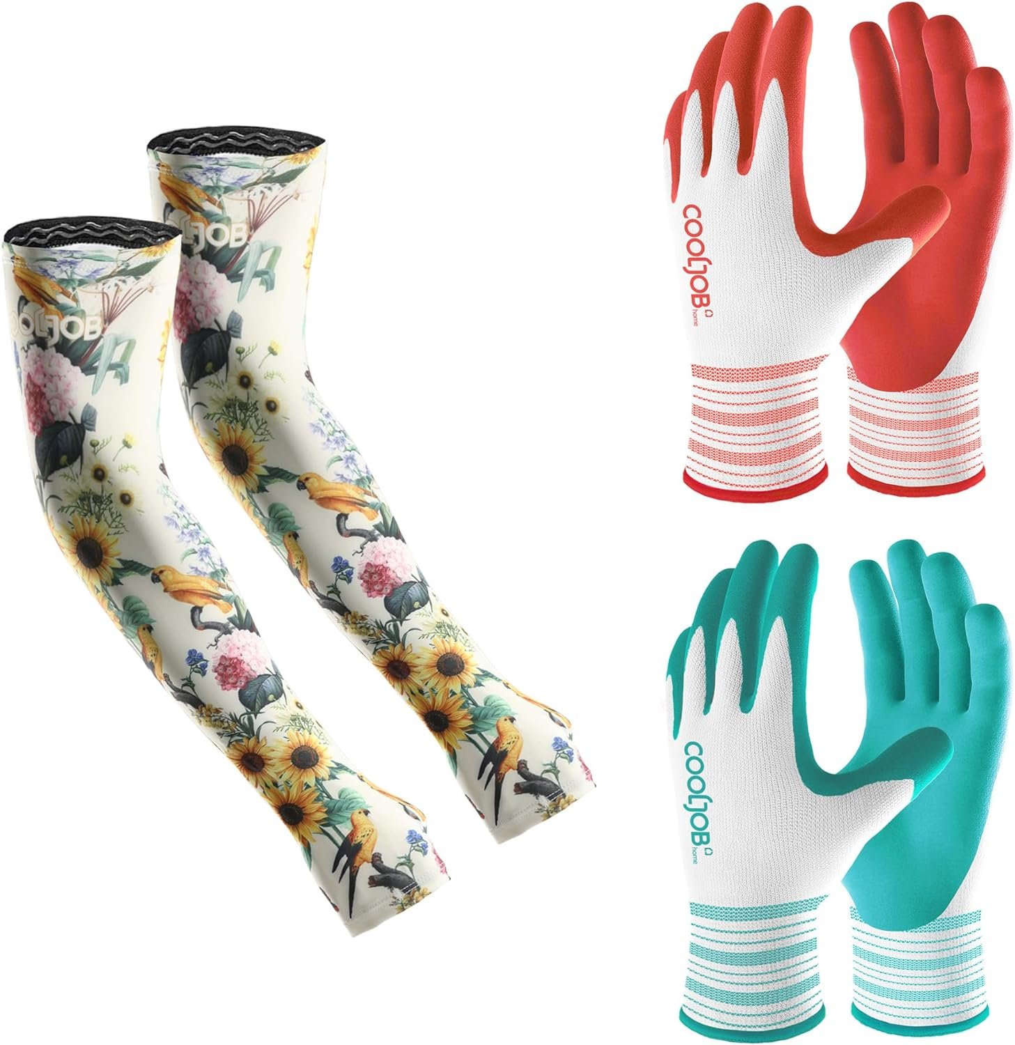 COOLJOB Cooling protective arm sleeves and COOLJOB Gardening gloves breathable rubber coated make gardening or farming tasks more comfortable, Pliable and skin-friendly sleeves & gloves keep you frigid and breathable in Summer, UPF 50+ arm sleeves protect your arm from 99.8% of harmful UVA and UVB rays, giving your arms complete UV protection and keeping your skin vigorous. Gardening gloves with foamed latex coating reduces fatigue. Ideal for harvesting, farmer, garden work.